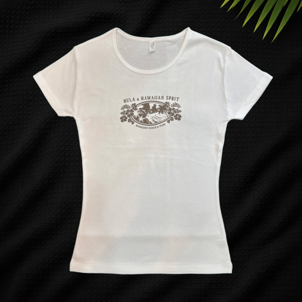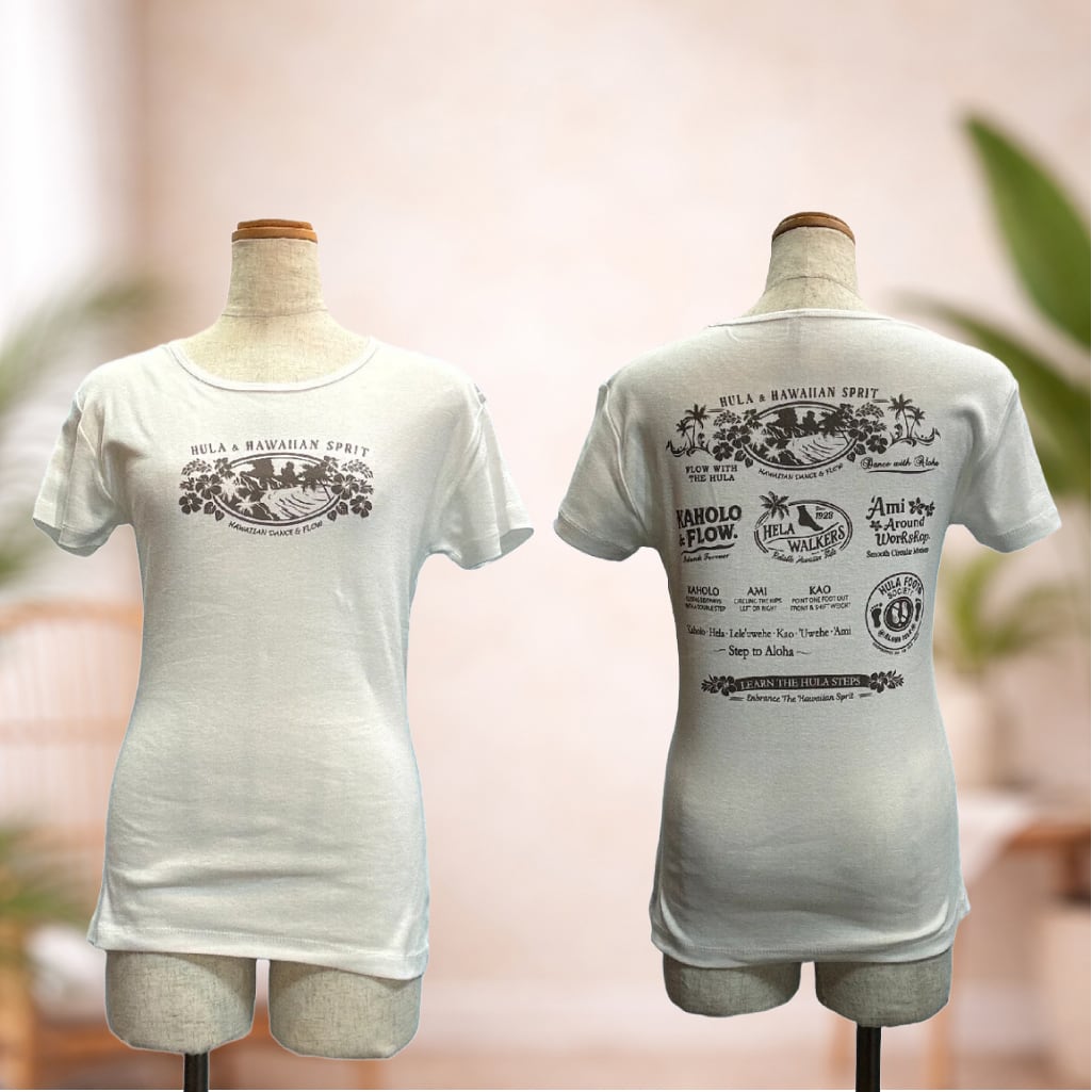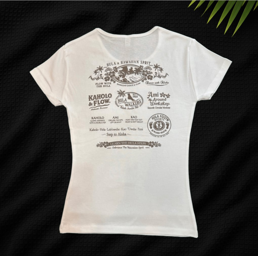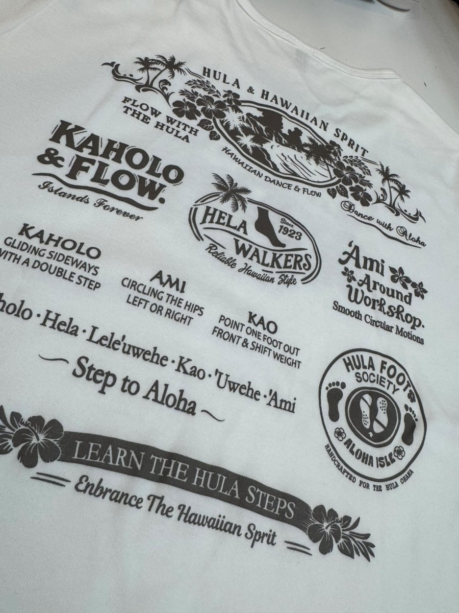 バックプリントは、ハワイのローカルブランドの集合広告風にレイアウトし、フラのステップをモチーフにした魅力的なデザインがとてもおしゃれです。