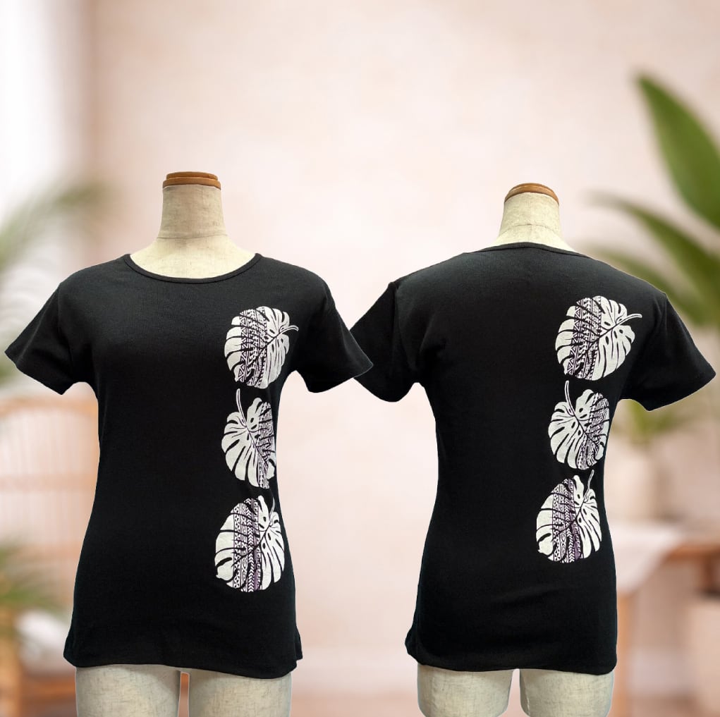 【速乾フライス新柄Tシャツ/モンステラ柄】ブラック/ホワイト